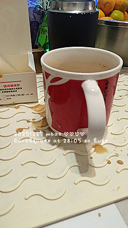 -白開水濺出來不稀奇,因為裝很滿、但熱奶茶都快喝完了……說,真可怕