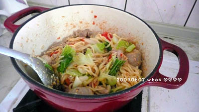-嗯,跟很重的小紅鍋還不熟,搞出有點乾的雜菜麵,反正我家不是走賢慧路線沒關係,而且小紅鍋的第一煮是拿來煮水餃…….噗)))))