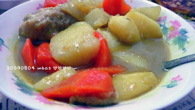 -我領教到了江湖上傳說鑄鐵鍋弄軟紅蘿蔔和馬鈴薯的功力…..太厲害拉,整個軟透到心裡哩,完全不用前置蒸熟作業耶,但是我還是沒有跟小紅鍋混熟,水放太多,醬汁噴得都是….Orz
